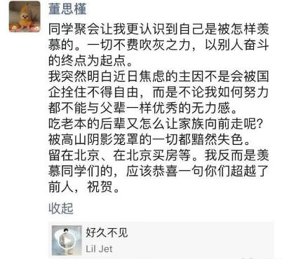 当然,董小姐也有自己的痛点。她与周公子一样以家族为荣,沉浸于“如何努力都不能与父辈一样优秀的无力感”中,但她并没与像当代青年一样选择躺平,而是继续力争上游,继续凭着自己的努力在中石油收割更优秀的“父辈”。