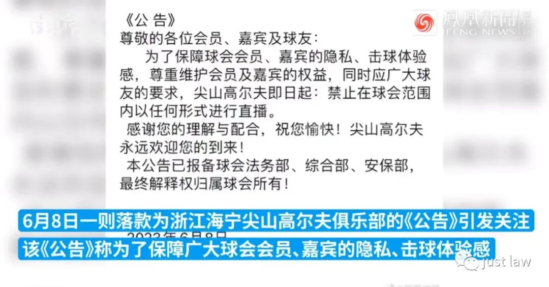笔者(公众号just law)注意到,这则发给该俱乐部会员、嘉宾及球员的《公告》提到,为保障广大球会会员、嘉宾隐私、击球体验感,尊重维护会员及嘉宾的权益,同时应广大球友的要求,尖山高尔夫即日起:禁止在球会范围内以任何形式的直播。