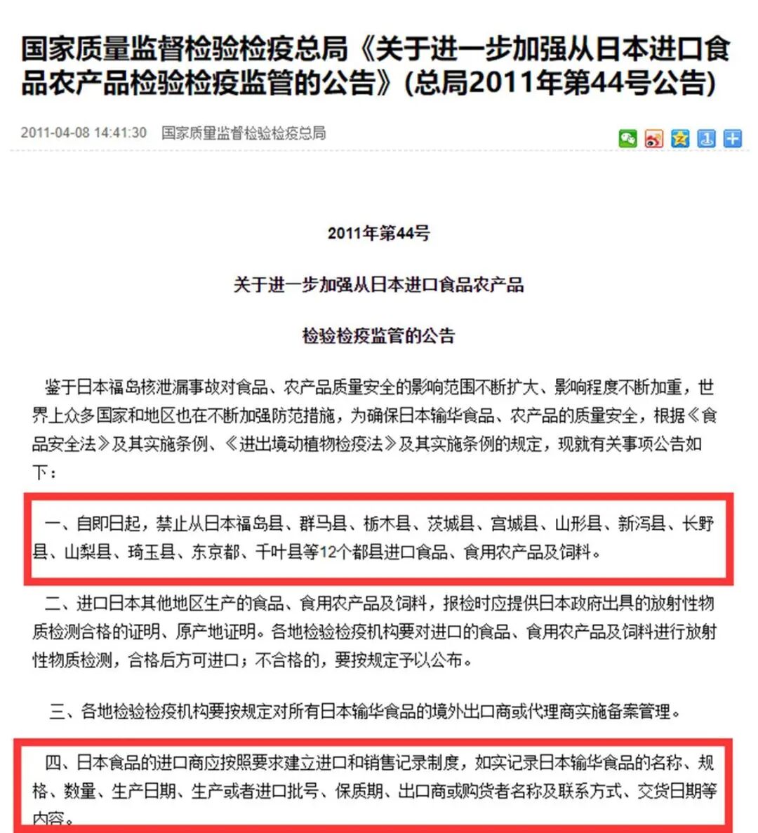 2011年4月8日国家质量监督检验检疫总局发布《关于进一步加强从日本进口食品农产品检验检疫监管的公告》,称自即日起,禁止从日本福岛县、群马县、栃木县、茨城县、宫城县、山形县、新泻县、长野县、山梨县、琦玉县、东京都、千叶县等12个都县进口食品、食用农产品及饲料。