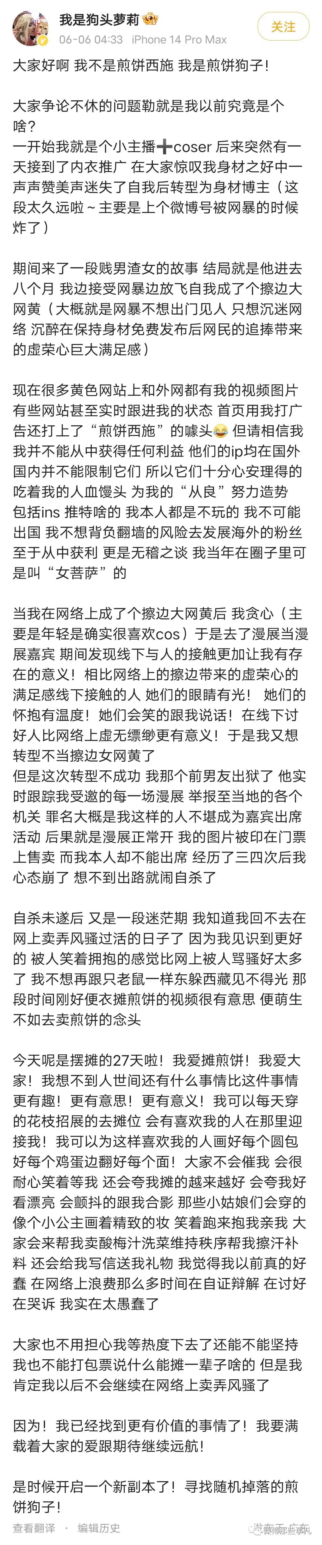 6月6日凌晨4点33分,曾经因在漫展被驱逐而“轻生”,最近因摆摊卖煎饼获得关注的美女“网红”狗头萝莉发微博回应了最近围绕着她的一系列争议,回顾了自己曾经自甘堕落,迷失于虚荣,成为“擦边”博主的经历,讲述自己转型失败,被前男友骚扰,又无法参加线下漫展,一时绝望想自杀的心路历程。最后表达了对当下生活的积极态度,“我爱摊煎饼!我爱大家!”,“我也不能打包票说什么能摊一辈子啥的,但是我肯定我以后不会继续在网络上卖弄风骚了!”