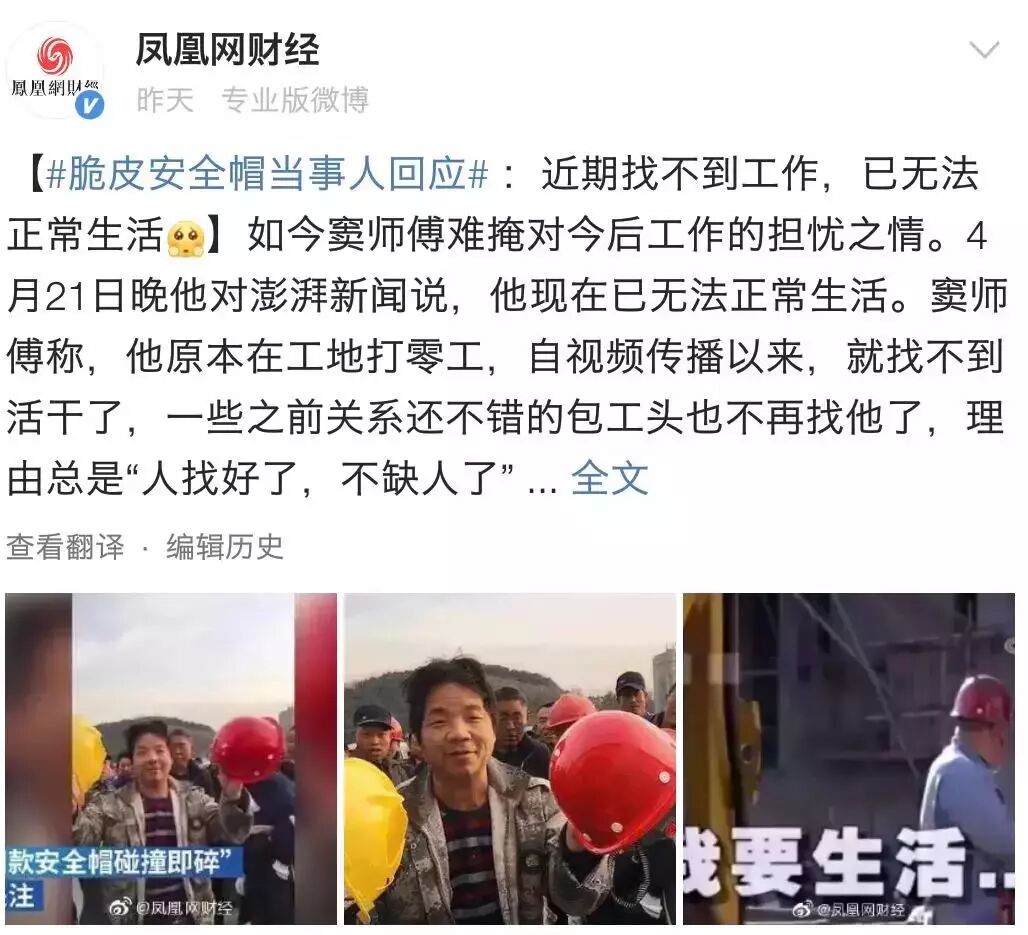 无奈之下,他在接下来的采访中又改了口,说视频中一碰就碎的安全帽是“自己买的”,而且工地负责人在这几天里已经给所有的工友改买了更优质更结实的安全帽。