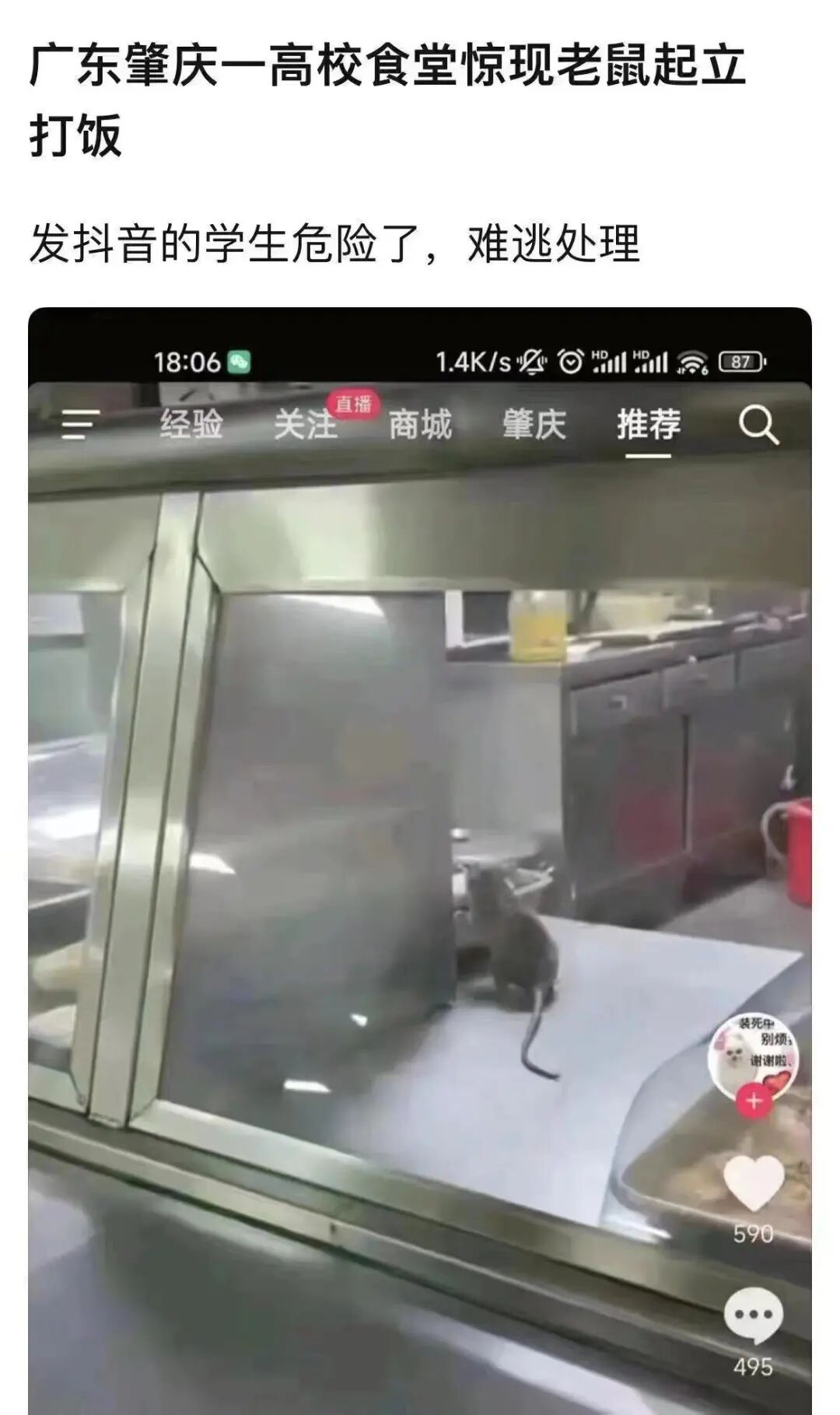 网传广东某地一高校,因为某个学生发了一条学校食堂里老鼠“起立打饭‘的抖音,而被学校辅导员要求核查,要找出到底是谁发的。