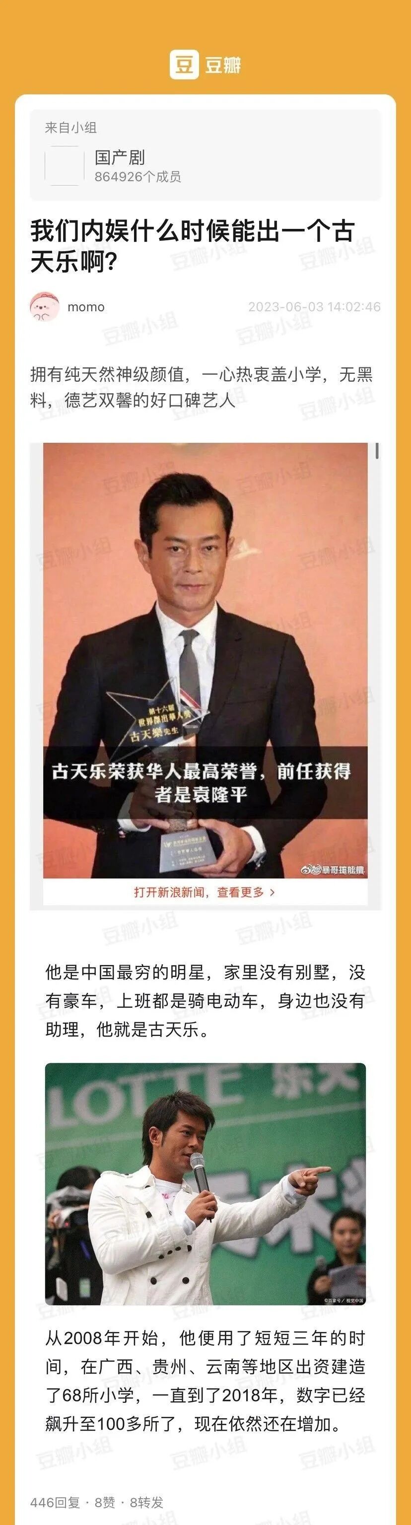 挺梓_522:惊呆!以前看过通稿说他为了做慈善疯狂接戏,不管什么质量类型的都接,赚到片酬就捐给希望小学。还有就是迷途知返励志人设。结果是这样的吗!三观震