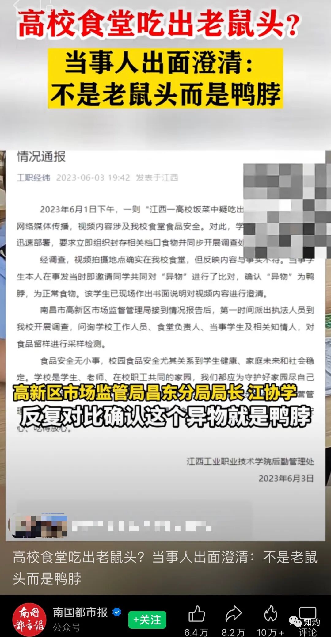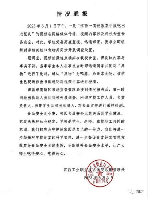 6月1日,有江西工业职业技术学院学生网上发视频称,在校食堂吃饭时,饭菜中混入了一个异物,定睛看,牙齿、胡须若隐若现,这根本就是一只老鼠。