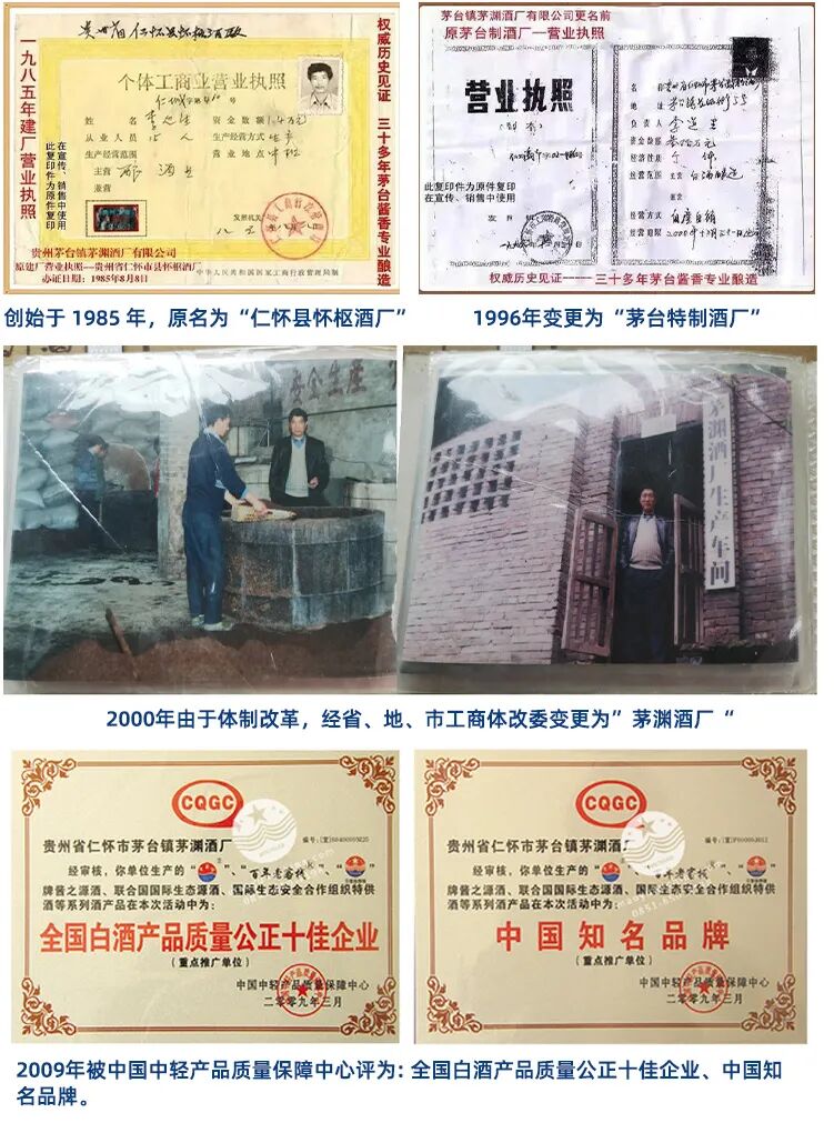 酒厂创始于1985年,1996年变更为“茅台特制酒厂”,2000年更改为“茅渊酒厂”。