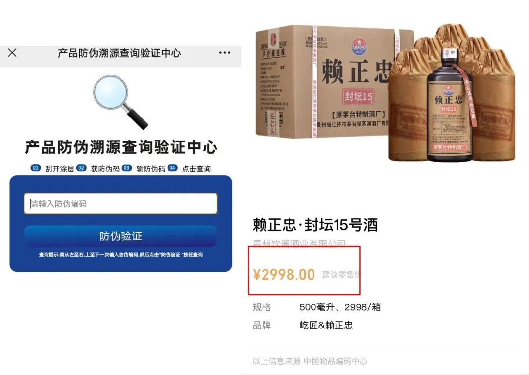 每瓶酒的瓶口处自带防伪二维码,扫码价格是2998元,十分给力!