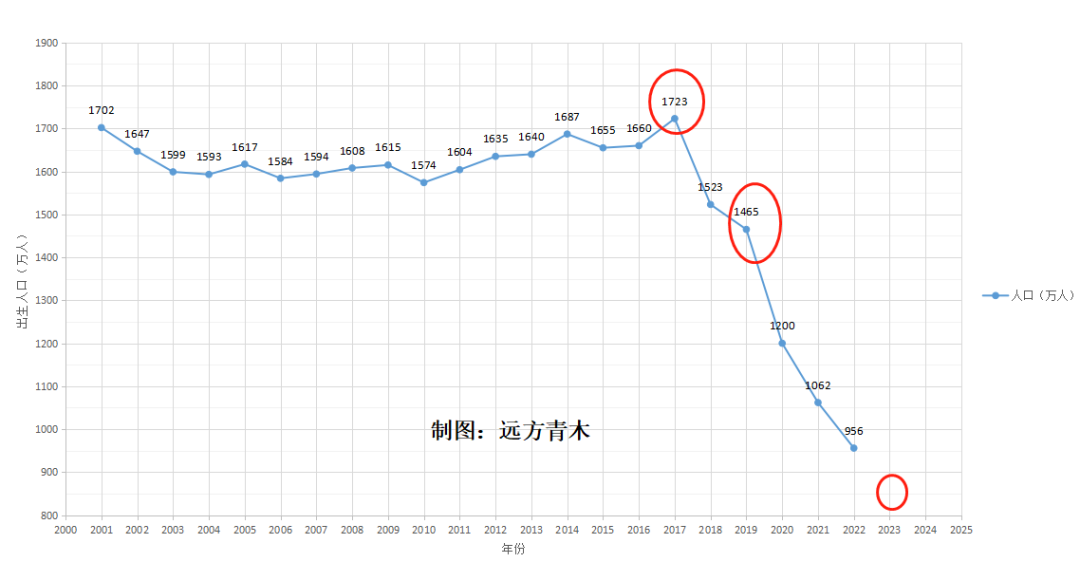 先把最近20年的中国人口出生图贴出来给你们感受下直观的大数据区别,我把三个宝宝的出生年份都标出来了。