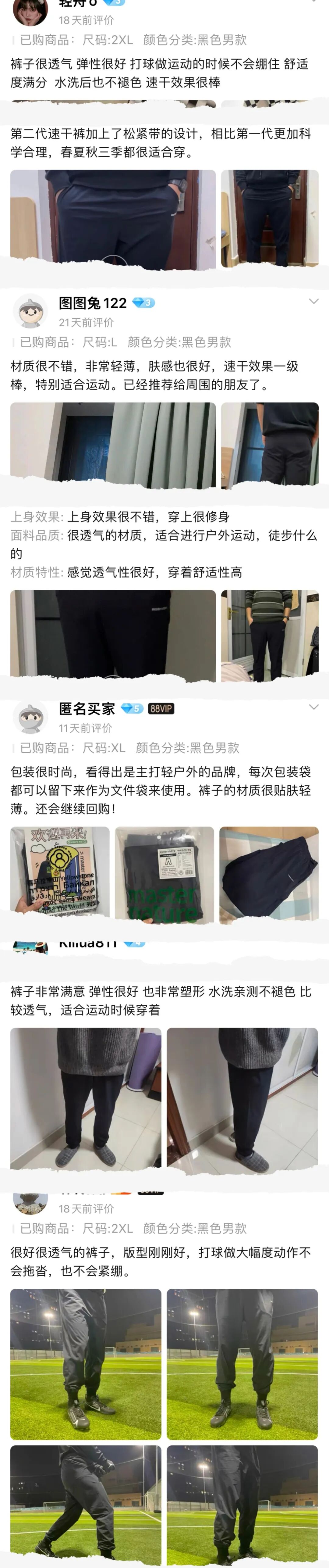 穿着去打球、跑步、举铁,怎么动都不会紧绷卡裆!再也不怕出现尴尬状况啦~用硬毛刷大力、快速地来回摩擦了50多次,面料都没任何变化,依旧光滑平整如初!难怪这条裤子穿了2个多月还跟新的一样,特别耐穿,估计多穿一、两年也不会显旧!面料的垂坠性也非常好,就算反复洗涤,揉搓,依旧能保持丝滑垂顺,没啥皱痕。再加上九分裤长,高腰、上宽下窄的利落版型,包容多种腿型,自带“拉长”和“收窄“作用,让整个人看起来爽利,不拖沓,倍儿精神!黑、灰、米、深灰绿4色,简约百搭,不挑年龄、肤色。男女同款,尺码很全,100斤-200斤都能穿,几乎揽包了所有身材。还能适应你随时“波澜起伏”的体重,不管胖点瘦点都还能再穿。