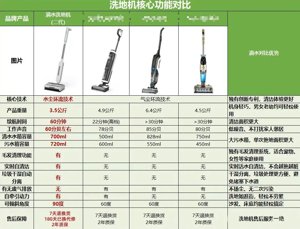 所以买回去的人都说很好用、很方便、清洁力很好,受到了很多消费者的认可!水箱和污水箱都一样是720ml大容量,每次从水箱出来清洗滚筒的水都会自动回流到污水箱中。水箱的水用完了直接拆下来拿去装水就ok了,拆卸也是很方便的!一台滴水洗地机就轻松帮你解决扫地、拖地、清洗等步骤;这里附上跟其他品牌的洗地机的对比,大家可以参考看下;√60分钟 超长持久续航、轻松搞定300平米大空间;√无线清洁更自由,配合动力牵引技术,洗地如逛街,轻松扫拖洗不劳累;√处理毛发功能,产品在尘盒中加入了毛刷,干毛发湿毛发都能进行处理。-商品信息-