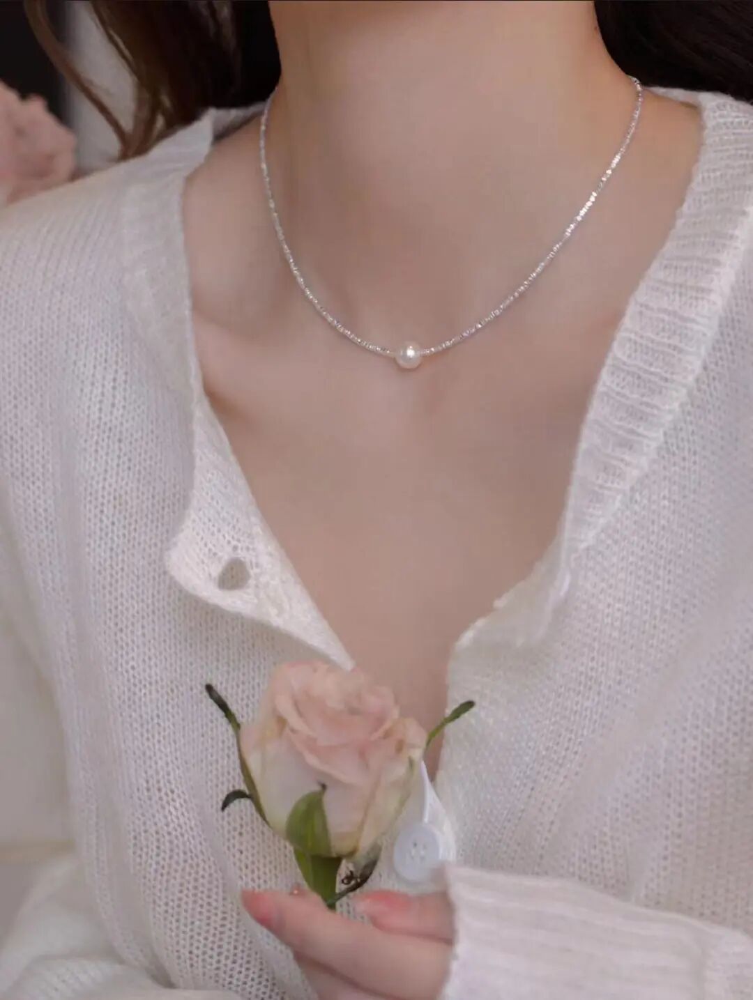 素色的衣服,配上这条项链,衬得整个人的皮肤白皙透亮,有种很精致的氛围感。珍珠用的是10mm的施华洛世奇贝珠,无论是光泽度还是质感都是超品天然珍珠的平替。都说“珠光宝气”,光泽是珍珠首饰的灵魂所在,上等材质才能散发出温润的光泽。