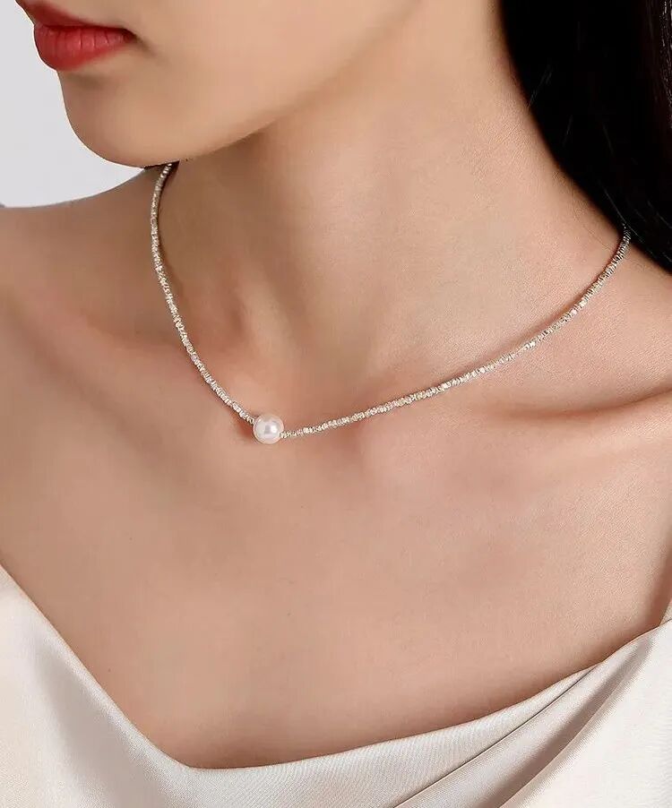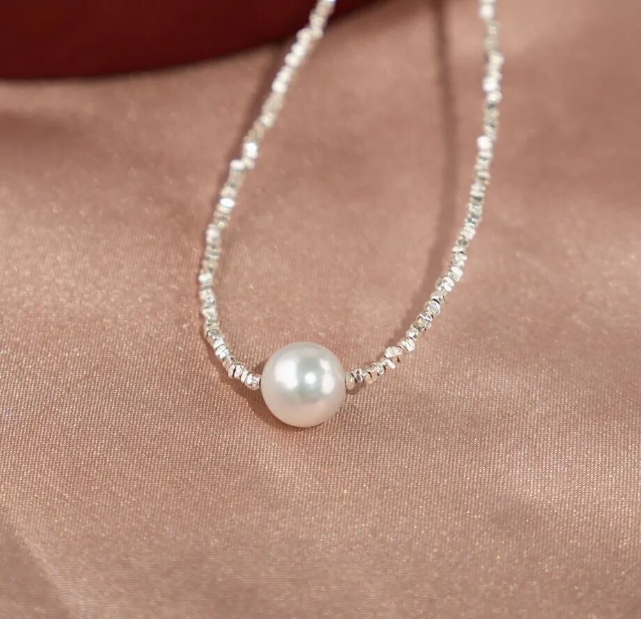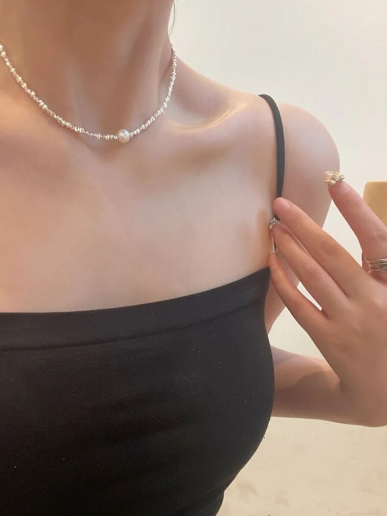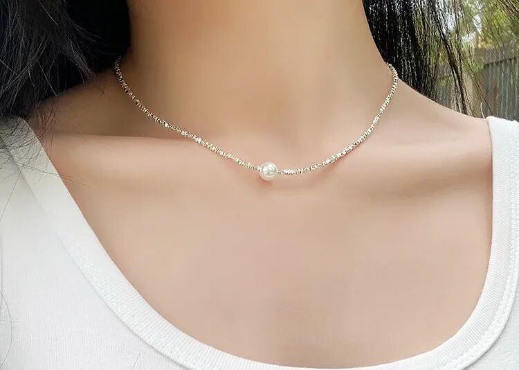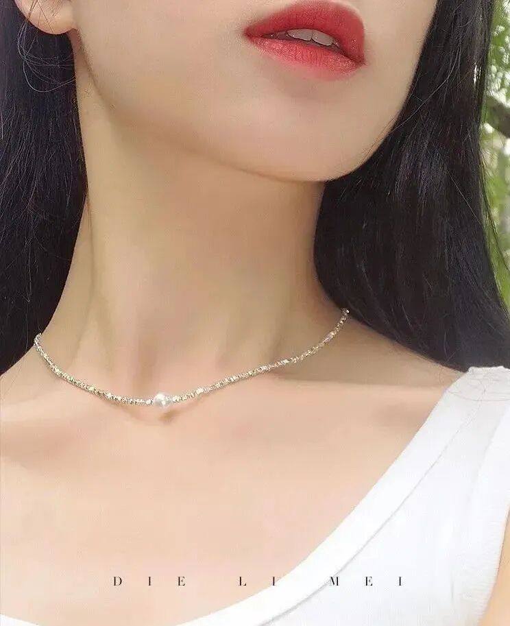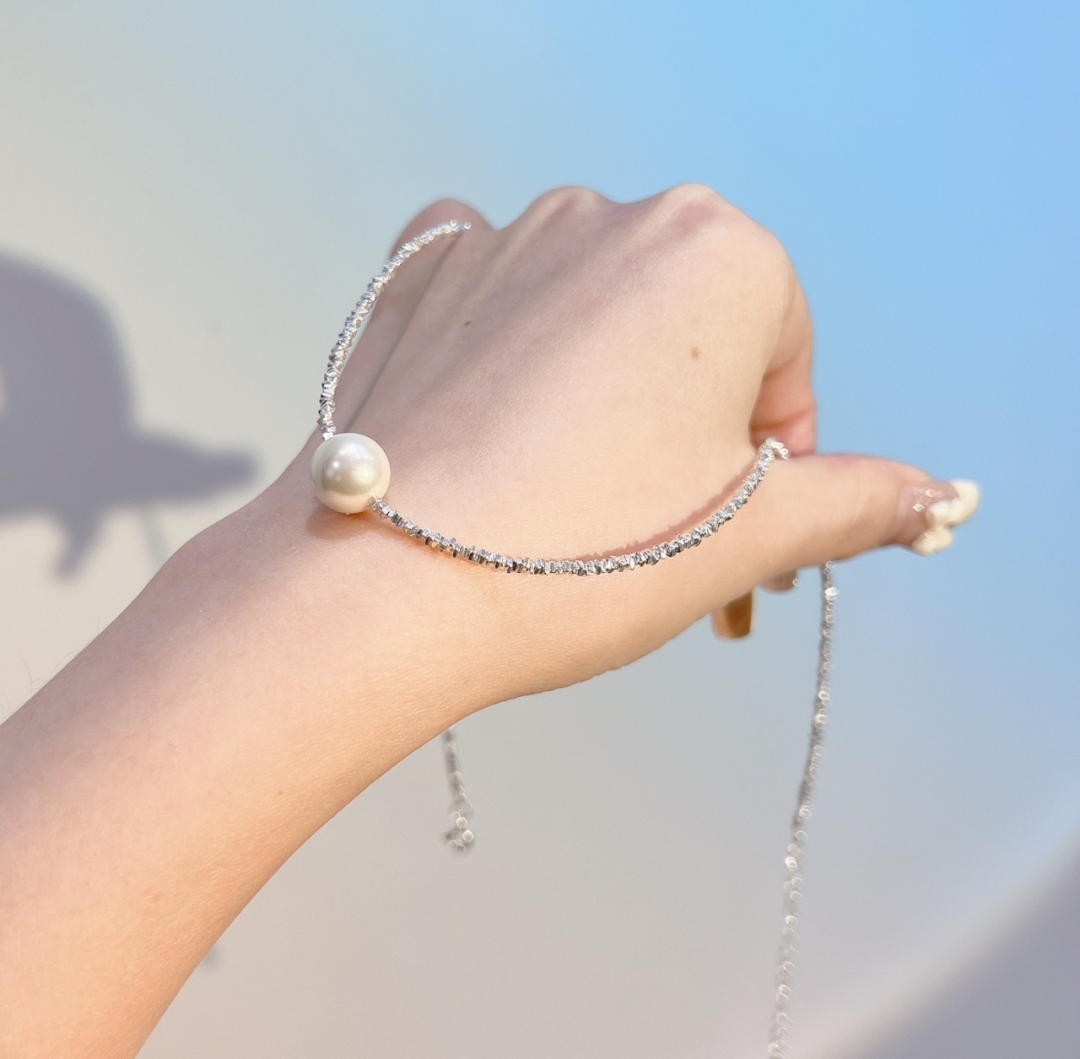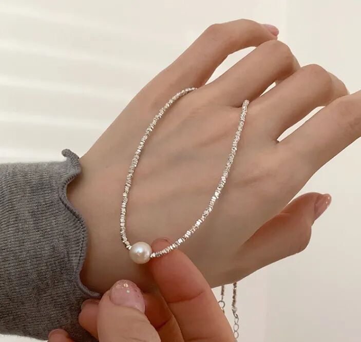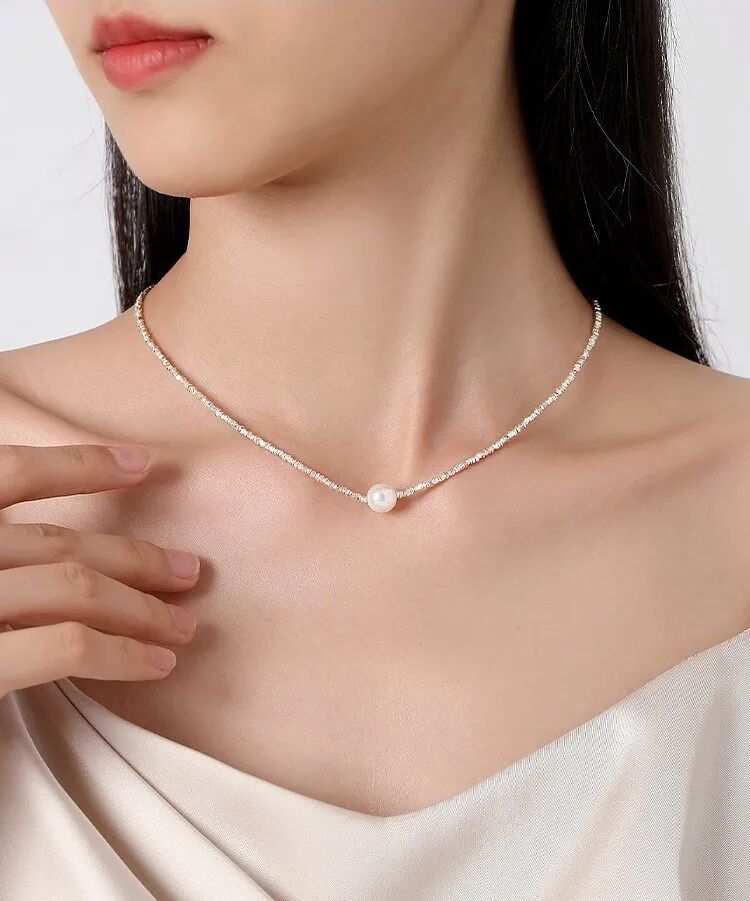 用来搭配珍珠的碎银链子是s925纯银的,不是粗制滥造,对金属敏感的同学也不用担心。纯银s925的链子,通体没有其他金属合金,光泽感和质感很强,在太阳光微微细闪,这种款式现在也很流行。比18k金的材质多了份安心,又比黄金首饰多了份低调。由许多个平平无奇的不规则小银块组成,冷淡风的质感。