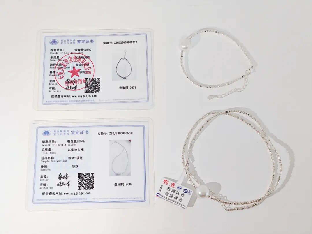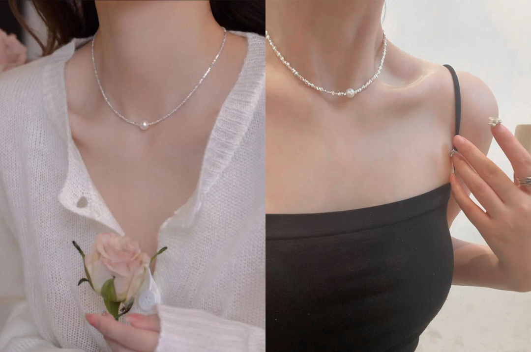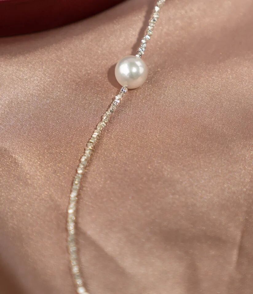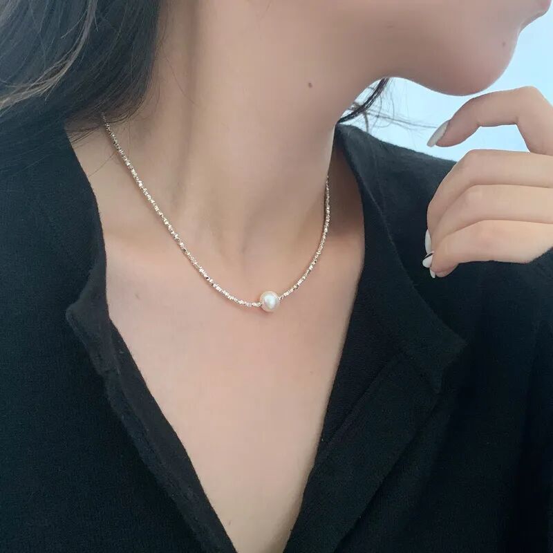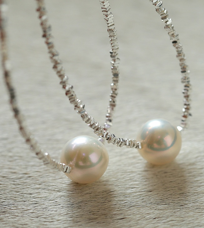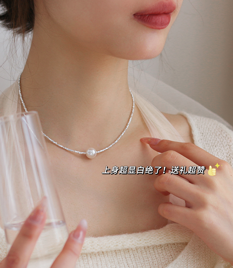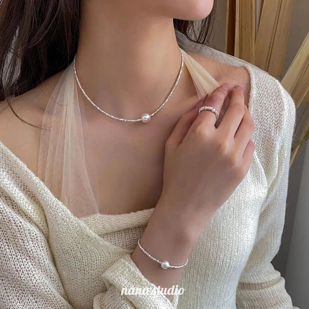 用来搭配珍珠的碎银链子是s925纯银的,不是粗制滥造,对金属敏感的同学也不用担心。纯银s925的链子,通体没有其他金属合金,光泽感和质感很强,在太阳光微微细闪,这种款式现在也很流行。比18k金的材质多了份安心,又比黄金首饰多了份低调。由许多个平平无奇的不规则小银块组成,冷淡风的质感。