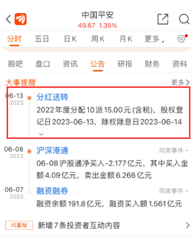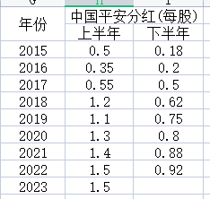 而且在过去的七八年里,招商的每股分红年年都在涨,一年更比一年高。后面即便哪怕招商增长率大跌,从高增长银行变成低增长银行,每股分红每年只涨一点点,只要他的分红一直在涨甚至只要不跌,那这个5%的分红率我可以拿10年。有本事股价一直冷在地板上10年别动,给我开开眼界。中国平安,每年分红2次,上半年一次下半年一次,今年上半年每股分红1.5元。![]()