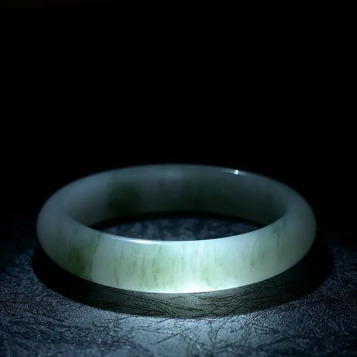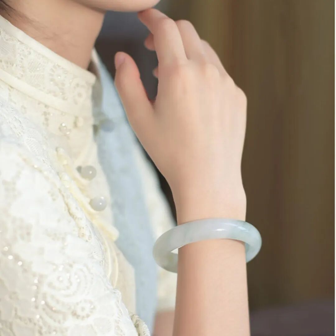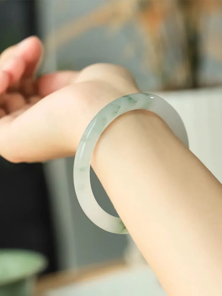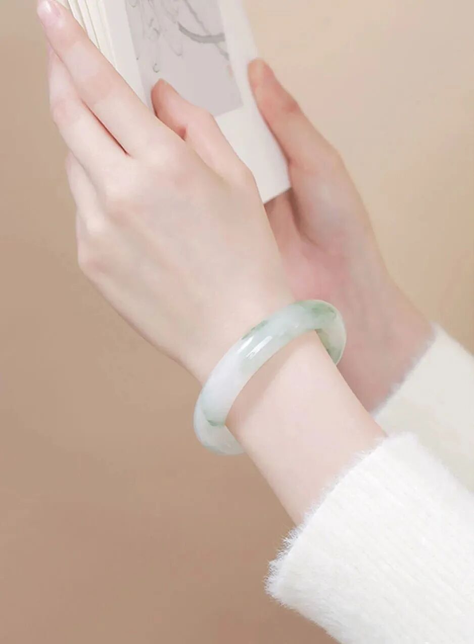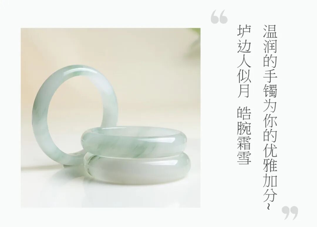 天山冰翠玉镯通体乳白,透着淡淡天然冰翠玉石绿纹,染上一丝丝清冷的气息,宛如雨巷里的古典美人;
