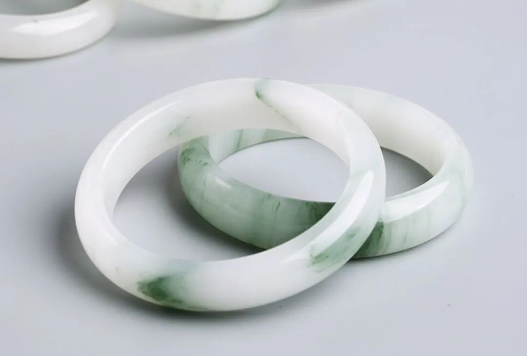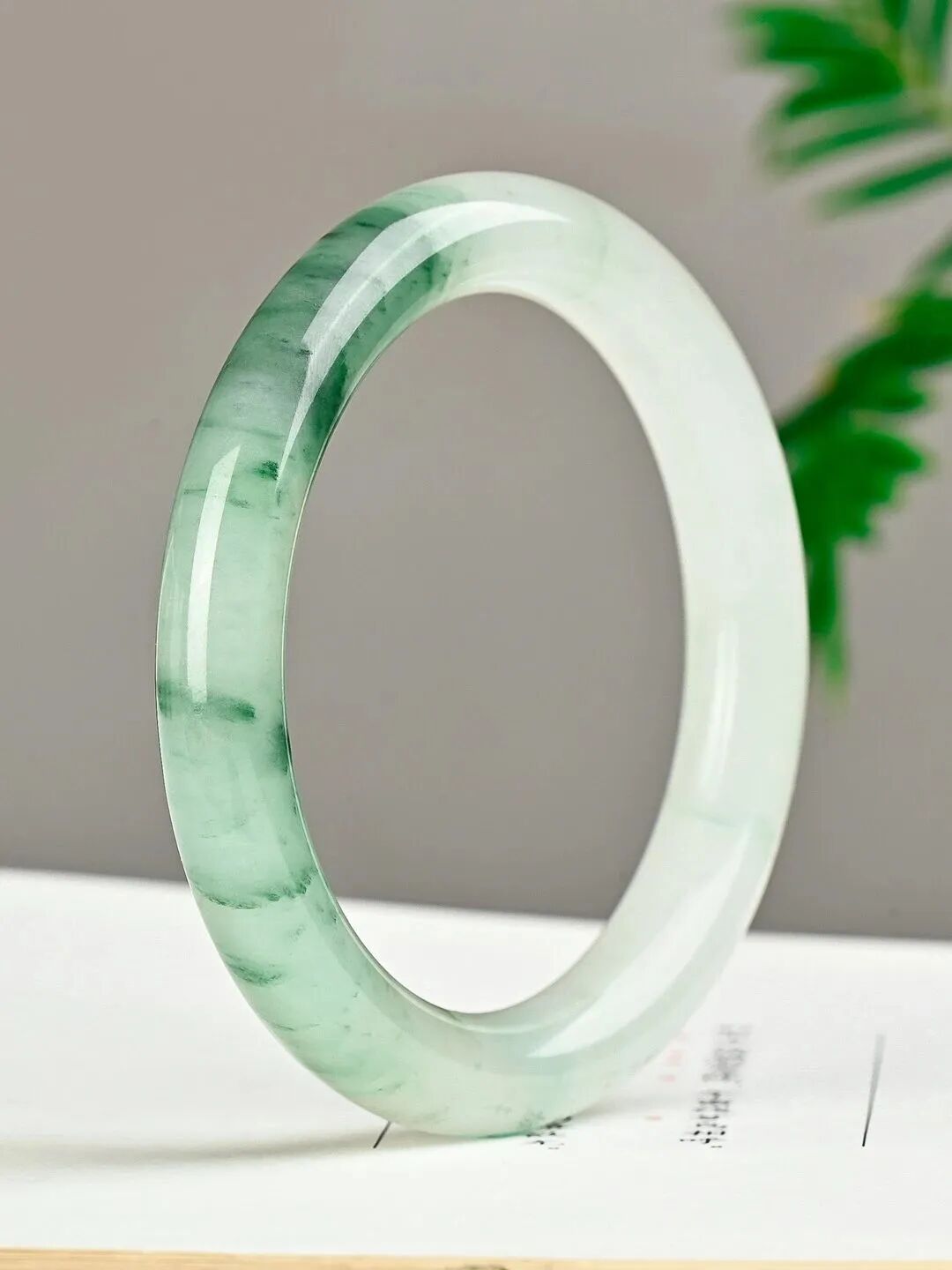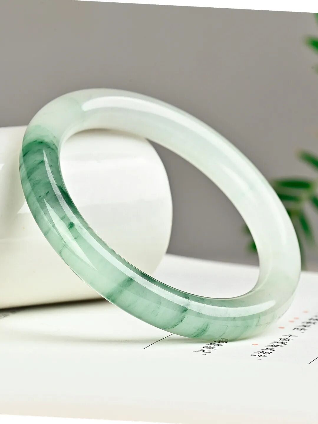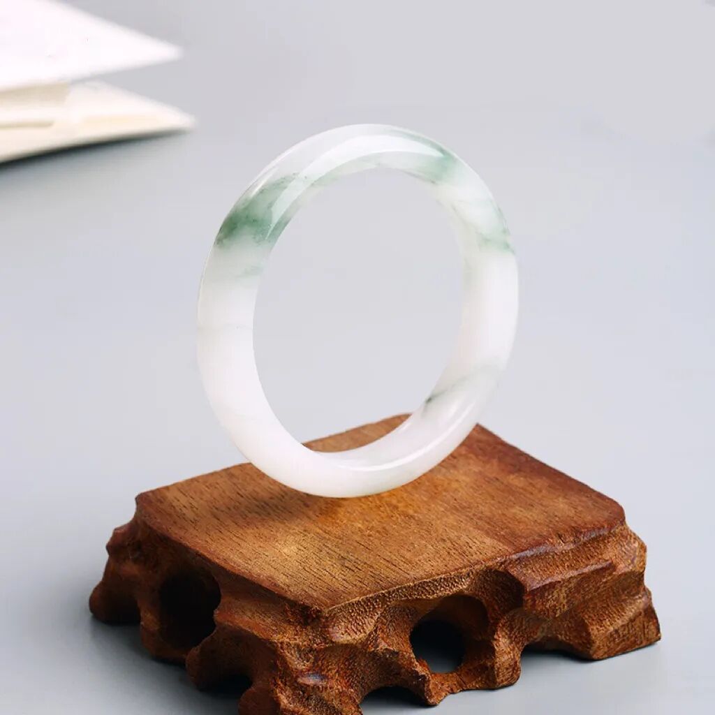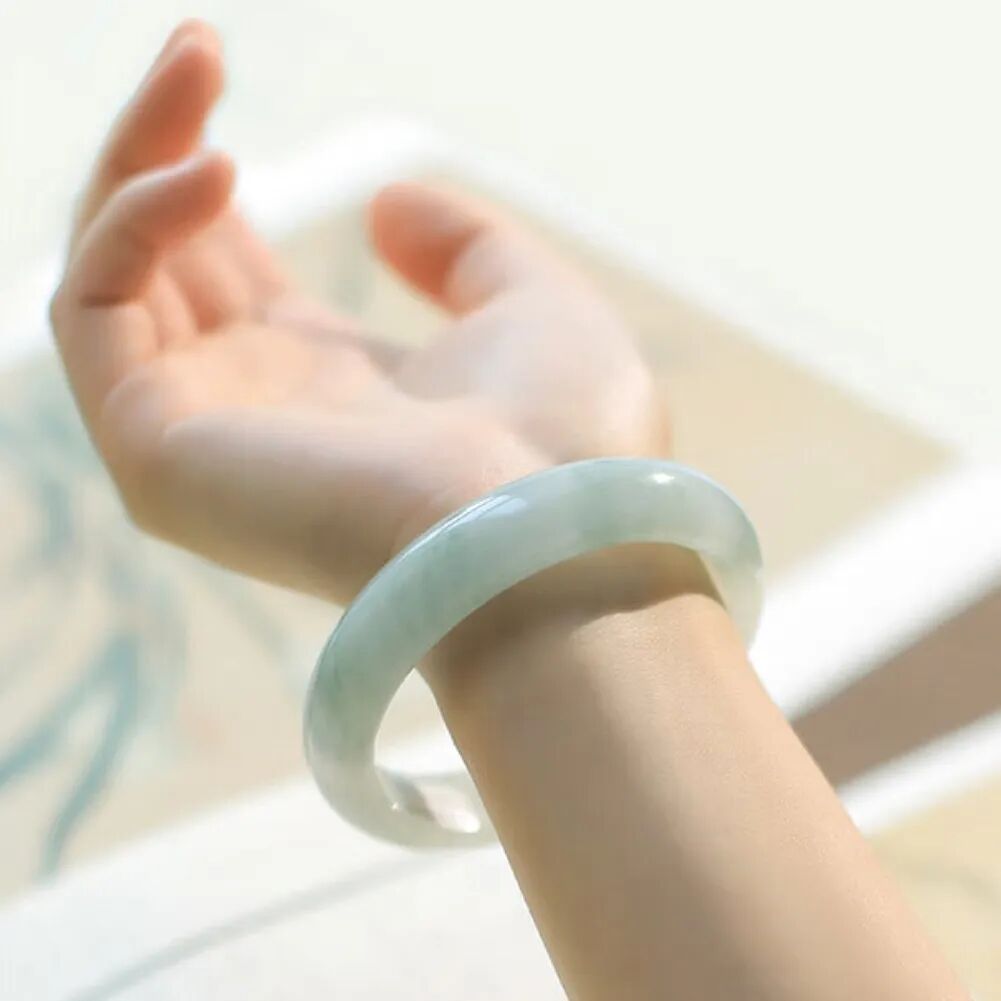 天山冰翠玉镯通体乳白,透着淡淡天然冰翠玉石绿纹,染上一丝丝清冷的气息,宛如雨巷里的古典美人;