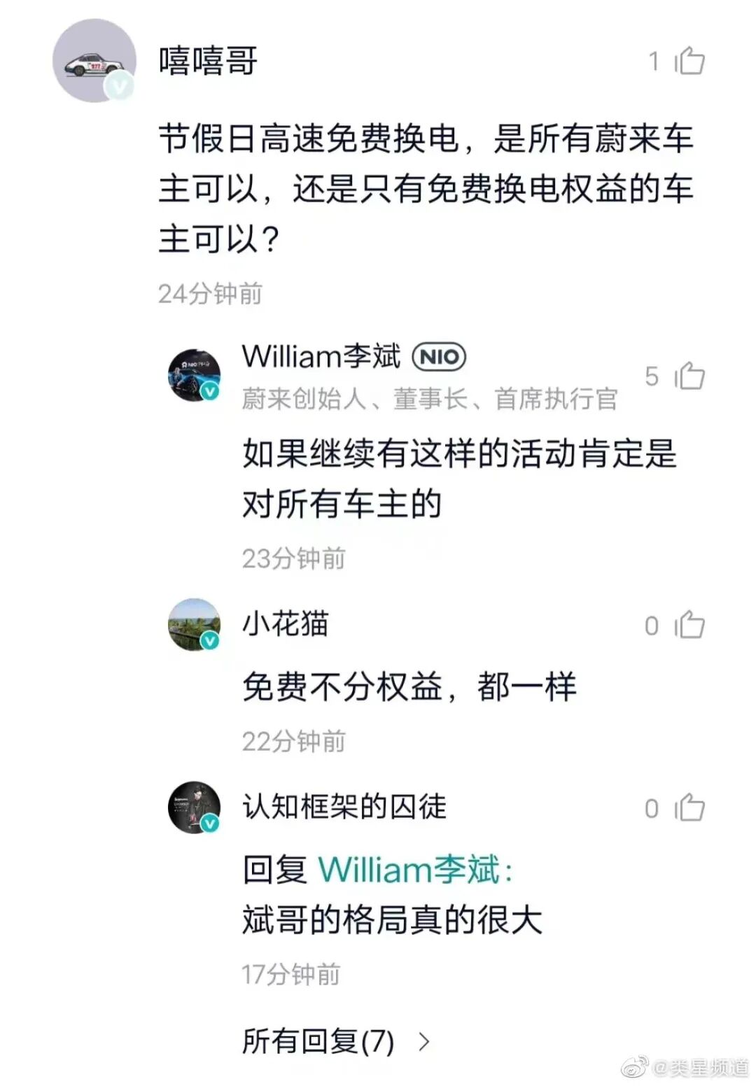 而关于车主们都关心的节假日高速还有没有免费换电的问题,李斌专门回复:如果有活动,肯定是所有车主都免费。