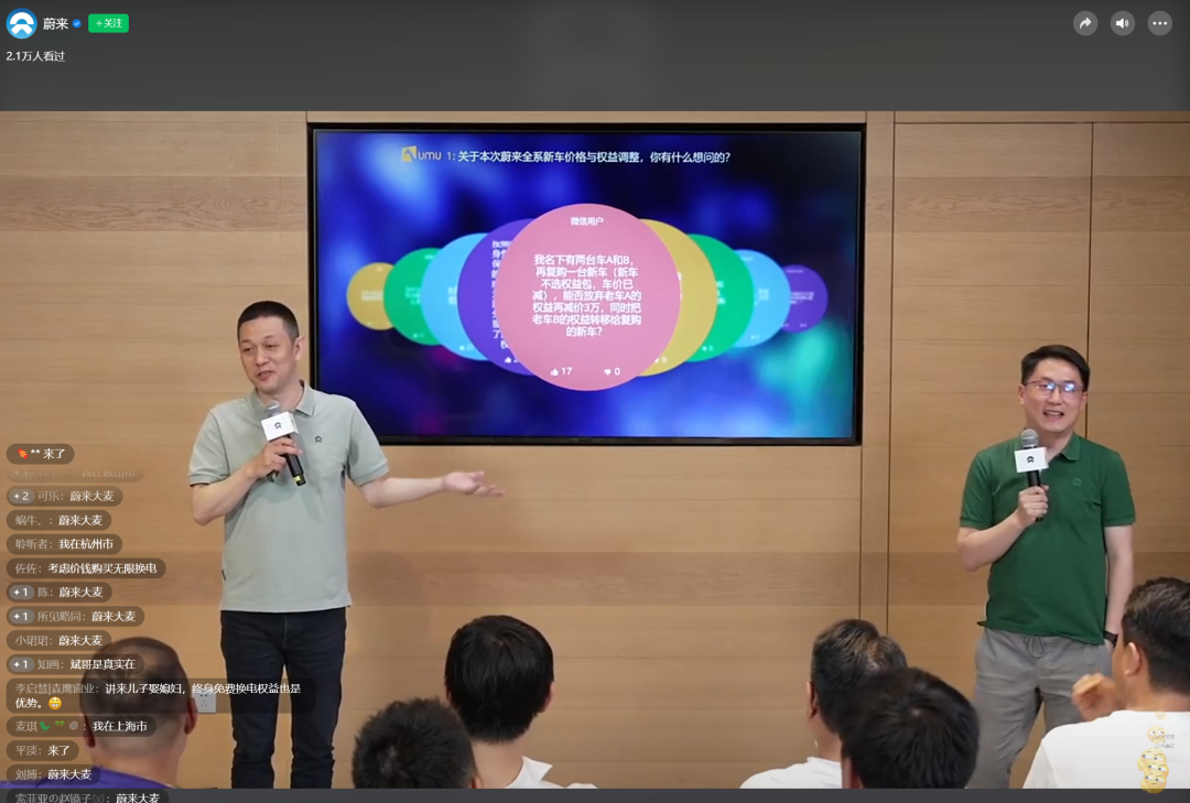 即便它要降价,还想方设法照顾老车主的情绪。为了能让大家理解自己降价的举措,蔚来今天下午专门给车主们召开了沟通会,李斌挨个回答大家的问题。