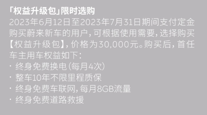 而为了缓冲一下,蔚来还推出了限时选购:在 7 月 31 日前,用户还是可以多加 3 万选择带终身免费换电的权益。