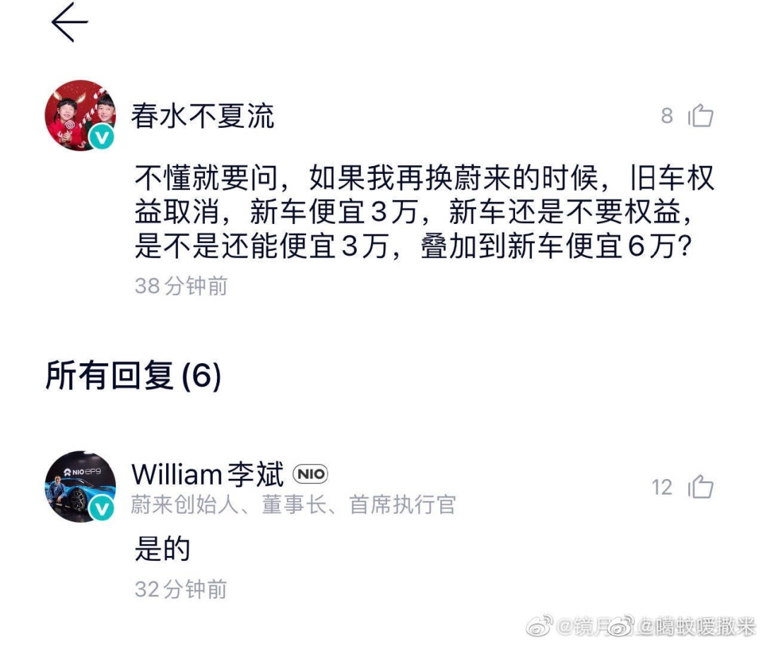 蔚来也给了一个解决方案,车主在置换车型的时候可以选择把换电权益抵 3 万,如果新车还是不换电,就是累计便宜 6 万。