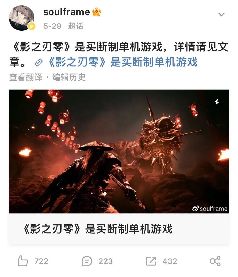 也不知他写下《 < 影之刃零 > 是买断制单机游戏 》的时候,心里想的是不是 “ 十年磨一剑,归来仍少年 ” 。