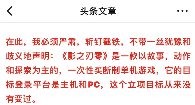 在这篇长文里,梁其伟感谢了玩家们对《 影之刃零 》的关注,并一口咬定: