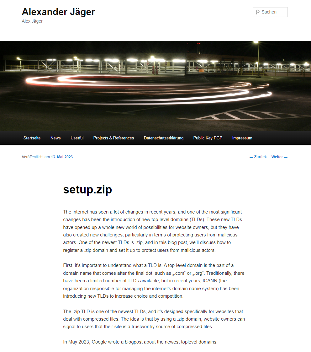 比如文章开头里提到的夸夸,就是在感谢一位叫 Alex 的大佬,他注册下来了 setup.zip 这个域名,用来宣传. zip 的危害性。
