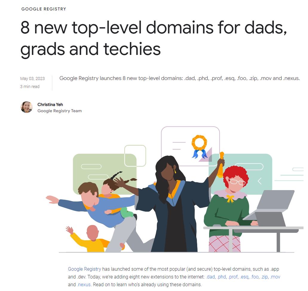 这事得追溯到 2023 年 5 月 15 号,谷歌开放出了一批新的顶级域名( TLD )给大家注册。