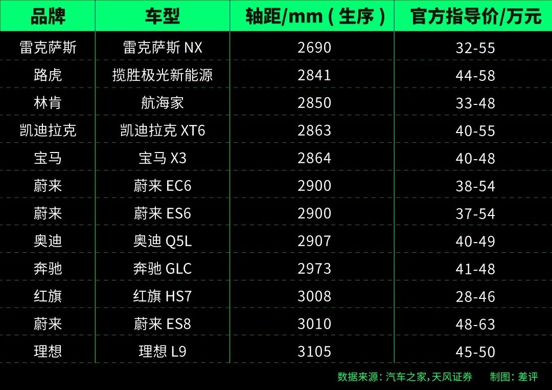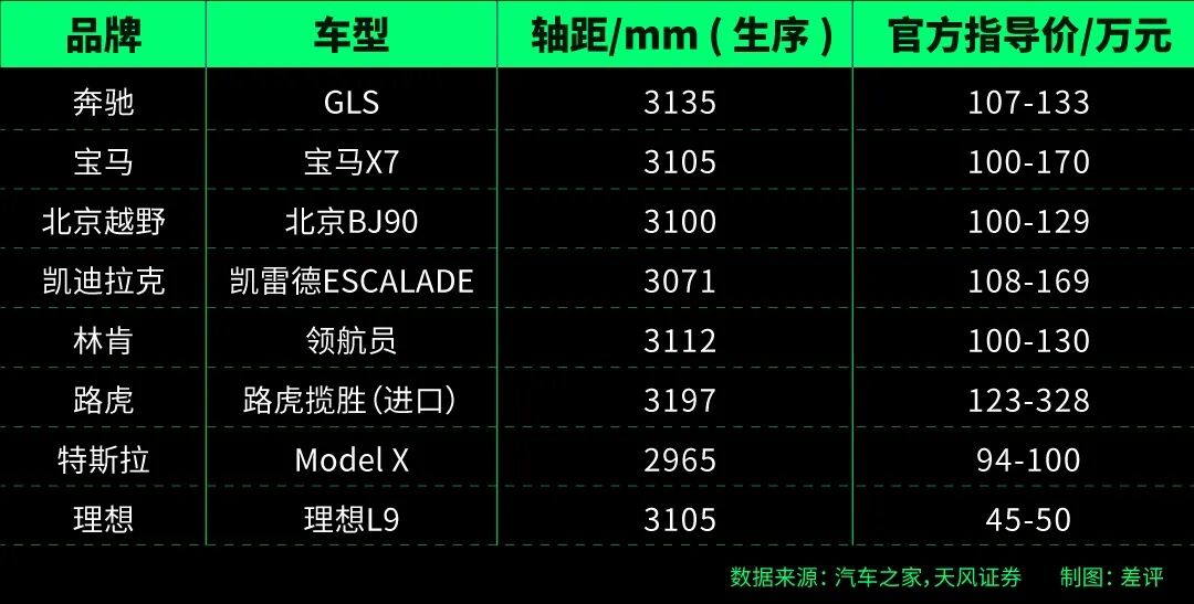 我们拿理想 L9 做例子,作为一款全尺寸( 轴距超过 3 米 1 ) SUV,过去市面上常见的类似车型价格都是百万级别,这么一看,四十多万性价比是不是就十足了?