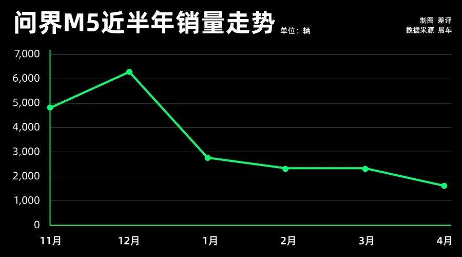 比如去年上市的问界 M5 ,去年一度打破了创新品牌单款车型交付破万最快纪录,妥妥的当红辣子鸡,但好景不长,随着特斯拉的降价等因素,销量持续走低,至今还没回暖。