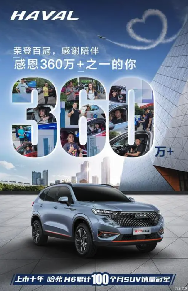 而这当中,最引人瞩目的当属一代神车哈弗 H6,H6 在 10 年里拿下了 100 次 SUV 销冠,这刚好印证了,在中国市场大空间+性价比永远是王道。