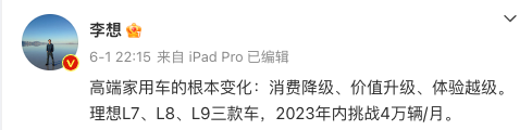 李想微博也直接放话,今年要挑战月销量突破 4 万辆。