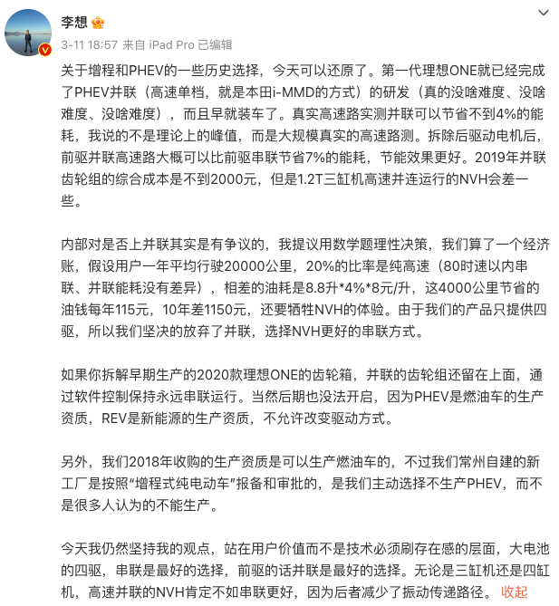 至于为什么是增程而不是比亚迪的 DM-i、吉利的雷神混动那种混并联技术路线,李想本人今年还在微博上专门回应过,表示自己在理想 ONE 时期就已经会了本田那套 PHEV 并联,这技术没啥难度也不费钱,最后选增程更多是因为考虑用户体验。