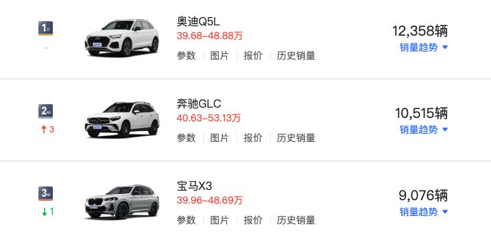 就算我们把范围再放大点,三四十万价位奥迪 Q5L、奔驰 GLC 和宝马 X3,它们仨加起来,今年上半年也都没达到过 4 万辆的月销。