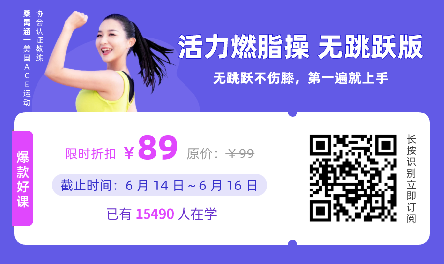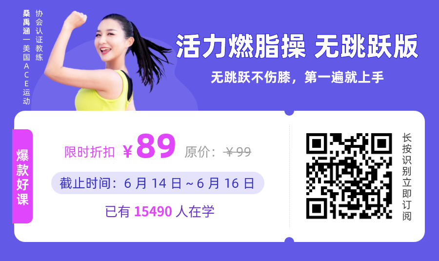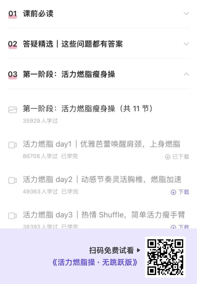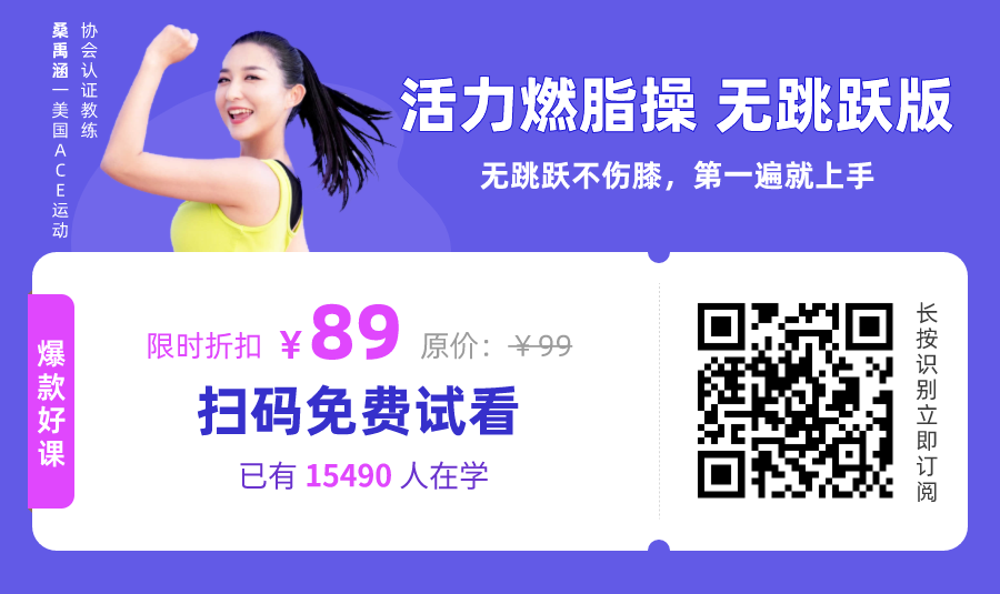 希望你也能找到适合自己的运动方法,扫描下面的二维码,就可以免费试看无跳跃的《活力燃脂操》。