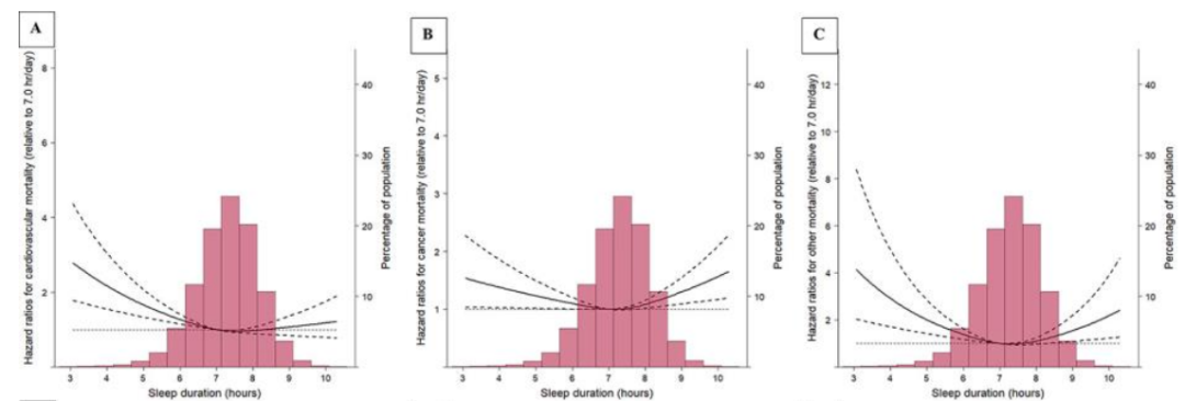 注释:实线代表不同睡眠时长人群的相对风险,可以看到各类死亡率的相对风险最低点都在 7-8 小时这一区间内