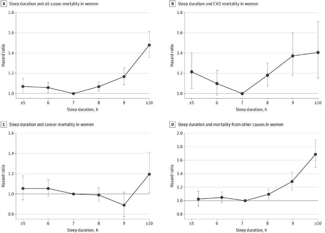 除此之外,研究人员还分别分析了各类疾病导致的死亡率与睡眠时间之间的关系,结果同样发现,在相关上,睡眠时间低于 7 个小时或超过 8 个小时后,由心脑血管疾病、癌症或其他原因导致的死亡率都会显著提升。