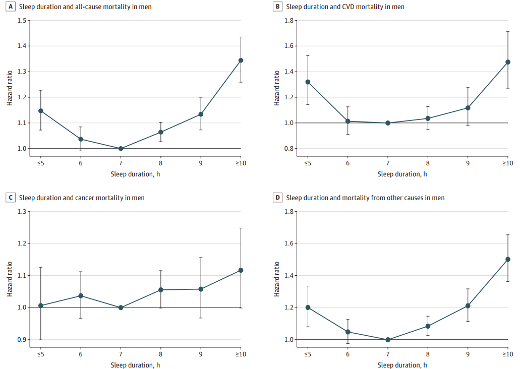 研究人员对所有参与者的全因、心脑血管疾病、癌症和其他死亡率和睡眠时间进行了相关分析,在校正了年龄、婚姻状况、身体肥胖指数(BMI)、烟酒情况、运动情况、慢性病史等情况的影响后,他们发现,这一相关的最低点,居然大多又是 7 小时睡眠。