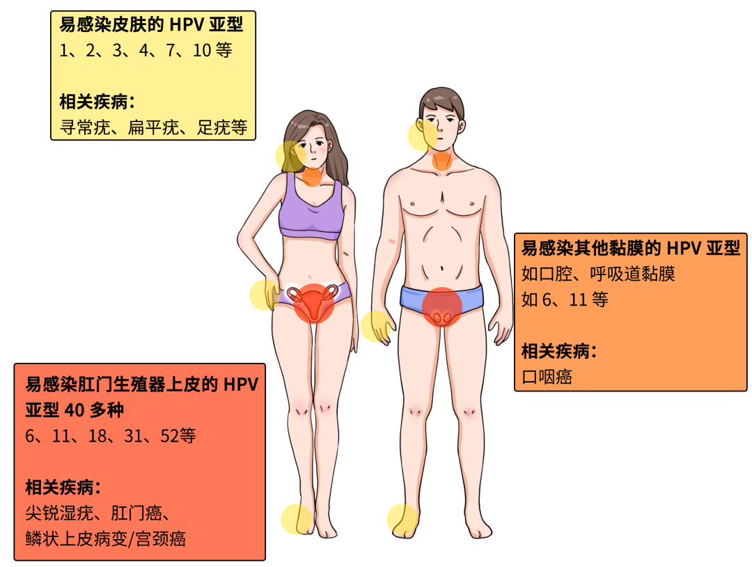 HPV 分为高危型和低危型两种。其中低危型 HPV,基本不会引发癌症,但可能引发一些疣类皮肤病变。[1]