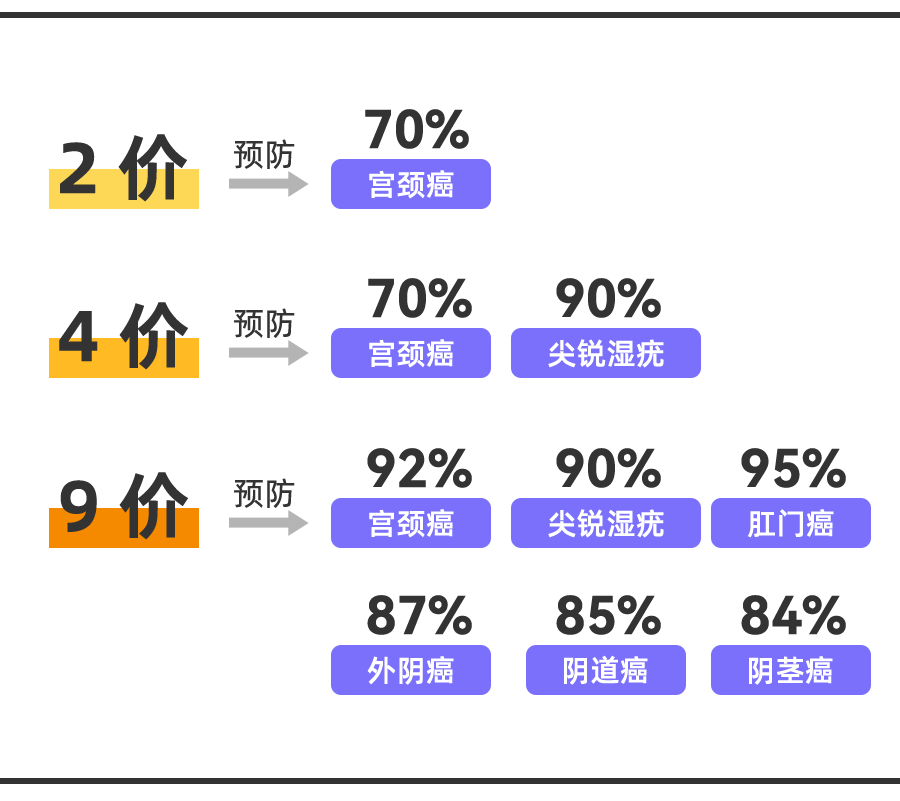 按照预防 HPV 型别来区分,目前有 2 价、4 价和 9 价三种宫颈癌疫苗获得批准上市,不同「价」可预防情况如下:[8]