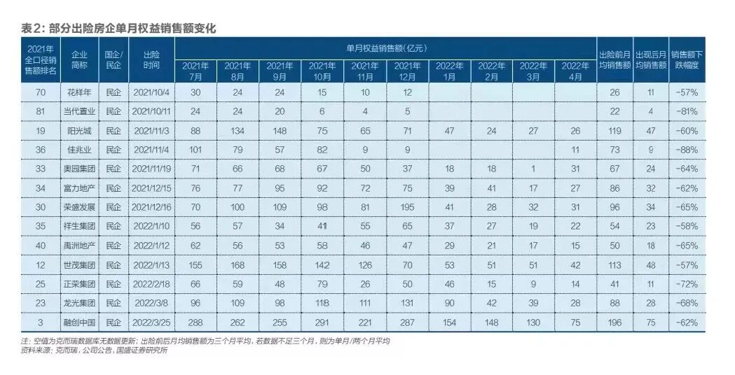 2022年5月28日,国盛证券发布研究报告指出,2021年克而瑞销售百强房企中,2021年下半年至今有30家房企出险(发生融资或理财产品违约、展期、交换要约等流动性风险事件)。百强房企中有70家民企,其中有29家出险,比例逾四成。并且出险企业的排名从靠后端逐渐向前端蔓延,民营房企的流动性危机愈演愈烈。