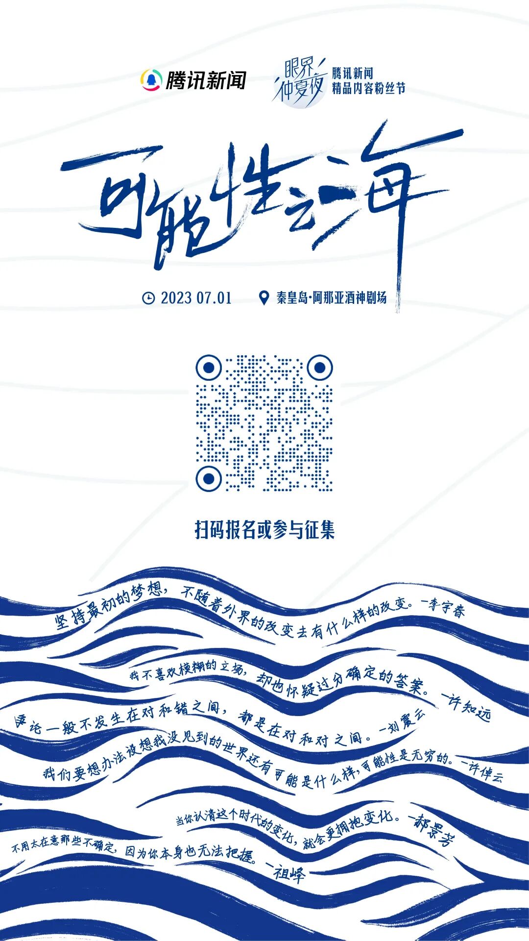 您可扫码参与征集,同时也欢迎您能报名参加我们7月1日在阿那亚举办的“眼界仲夏夜”粉丝盛典,和李敬泽、樊登、六神磊磊、王晋康等众多文化名人,一起探索美好内容之海,思潮碰撞之海,看见更多可能。