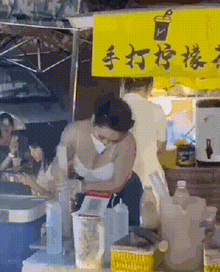 而这其中,要数一家卖“手打柠檬茶”的生意格外的红火,门庭若市。只见这家摊位并不算大,亮黄色的招牌上写着“手打柠檬茶”几个大字,