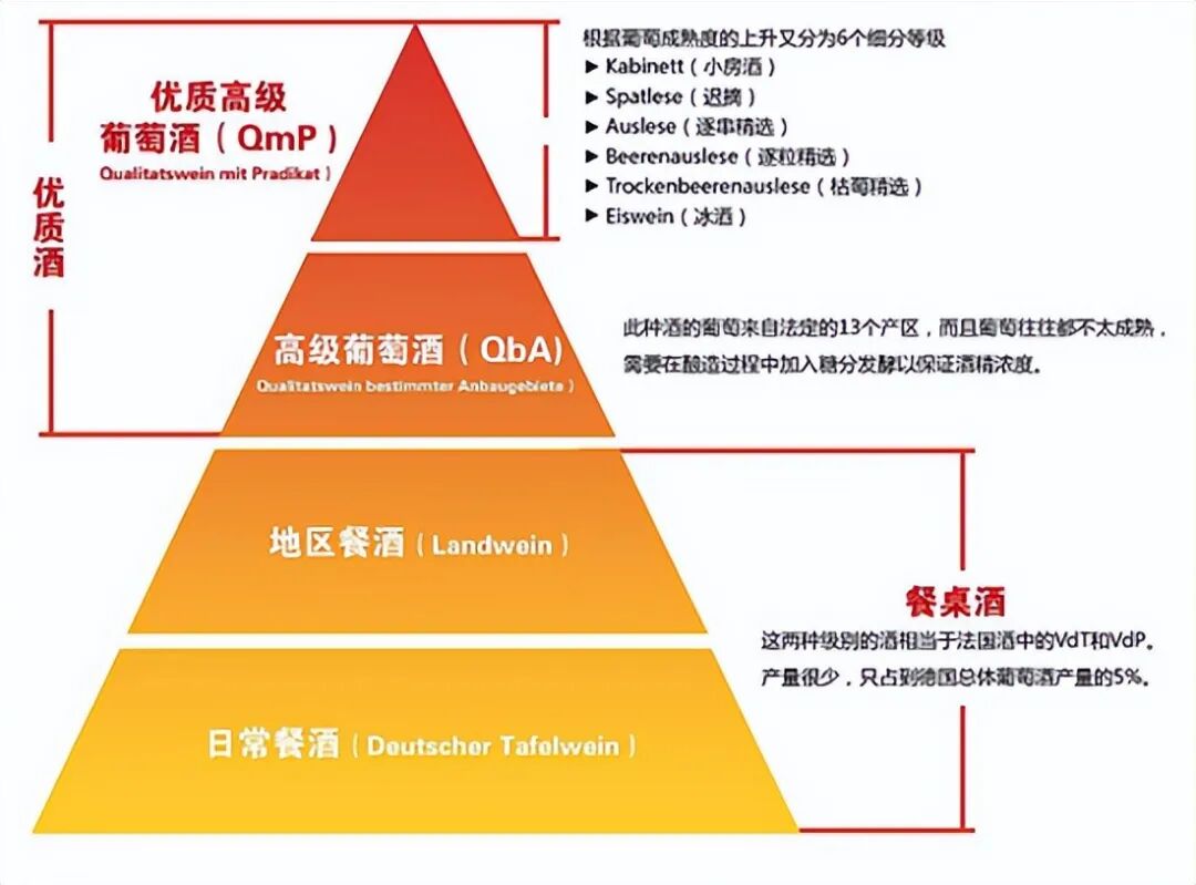 在德国,雷司令也是有等级之分的!包括:日常餐酒(Tafelwein)、地区餐酒(Landwein)、高级葡萄酒(QbA)、优质高级葡萄酒(QmP)
