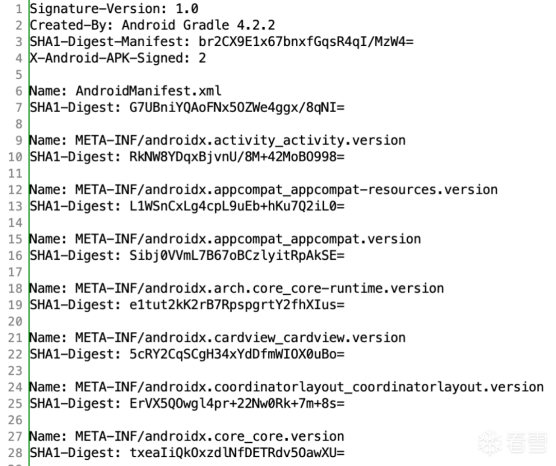 应用完成签名后应用中会新增 META-INF 文件夹,文件夹中包含如下三个文件: