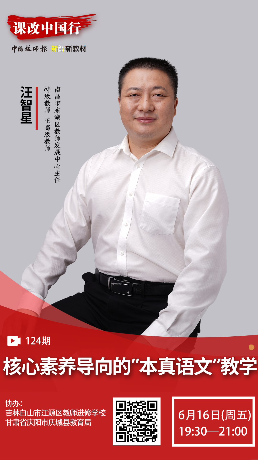 亚里士多德潜能实现理论指出:教育的本真正是充分、全面地发展人的潜能,使人成为人。陶行知也指出:千教万教教人求真,千学万学学做真人。因此,语文教学就是要以语文的方式让儿童成为具体的人,发展的人。本周五(6月16日)晚7:30-9:00,中国教师报“课改中国行·新解新教材”第124场在线直播,特级教师汪智星将为我们带来《核心素养导向的“本真语文”教学》。本次直播,由吉林省白山市江源区教师进修学校、甘肃省庆阳市庆城县教育局联合协办。(“课改中国行”公益师训会诚征线上、线下协办单位。咨询联系:15712959888杨智伟)汪智星,江西省督学,特级教师,功勋教师,正高级教师,现任南昌市东湖区委教体工委委员、区教师发展中心党支部书记、主任。兼任全国小学语文教学研究会青年教师教学研究中心委员,江西师范大学硕士研究生实践导师,江西师范大学公费师范生实践导师,南昌师范学院校外兼职教授,江西教育学会读写教育研究分会副理事长,江西省教育学会教育管理专业委员会常务理事,江西省教育学会小学语文教学专业委员会常务理事,南昌市教育学会副会长,南昌市小学教育教学指导专业委员会副主任委员,南昌市教育学会小学语文专业委员会副理事长,南昌市教育学会教育内刊专业委员会副理事长。被评选为《语文教学通讯》《小学教学》《江西教育》等杂志封面人物。获得江西省首届基础教育教学成果奖一等奖,江西省第七届教育科研优秀成果奖一等奖;成功举办特级教师汪智星“智慧、本真、清简”教育思想研讨会;在《中国教育报》《中国教师报》等报刊上发表论文180余篇;出版《汪智星与本真教育》《卓越型教师如何修炼》等8本专著。“本真语文”教学主张,倡导回归教学本真,回到教育教学的“常识”上来,牢记语文课程为了谁,语文课程是什么,语文课怎么上,进而对“本真语文”教学内涵进行了科学重构。讲座中,汪智星老师将从核心素养导向的“本真语文”教学主张的形成过程、核心素养导向的“本真语文”教学主张的内涵逻辑、核心素养导向的“本真语文”课堂教学的关键特质、核心素养导向的“本真语文”课堂教学的评价体系建构等四个方面展开解读。讲座中,他还将通过具体的课堂教学实例,就“本真语文”的具体教学实施做出讲解。