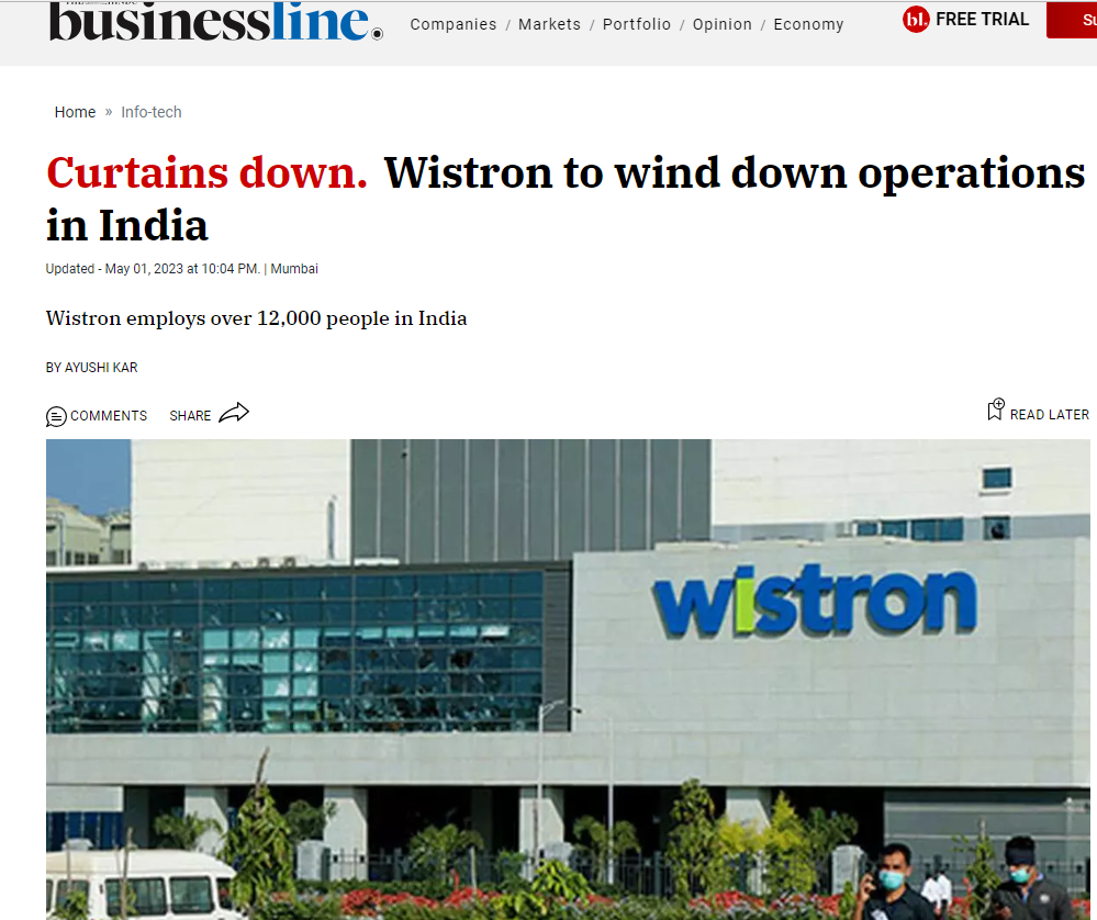 5 月初,就连在印度深耕 15 年的 ODM 大厂纬创资通(Wistron)也撤出了印度。