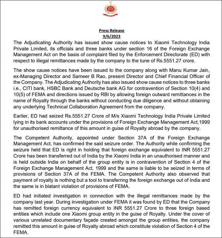 小米在印度栽了一个大大的跟头!印度发出正式通知:小米近 50 亿元人民币资金或被没收。
