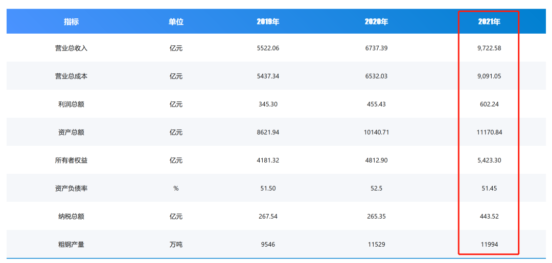 宝武集团官网显示,2021年,集团营业总收入9722.58亿元,利润总额达到602.24亿元。