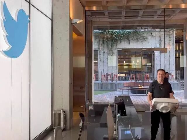 2022年10月26日,马斯克带着一个水槽穿过大厅进入旧金山的推特总部