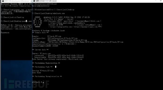 然后打开第二个窗口,这个窗口需要域管理员权限,我们用psexec以域管理员权限hack\administrator身份打开一个cmd窗口,然后执行如下的命令触发正常域控同步数据,如图所示: